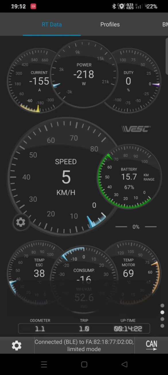 На VESC рекуперативное торможение происходит даже при малых скоростях. На фото пример из жизни, при скорости всего в 5км/ч, моторный ток целых 155 ампер! Хоть оборотов мотора совсем мало но веск продолжает тормозить.