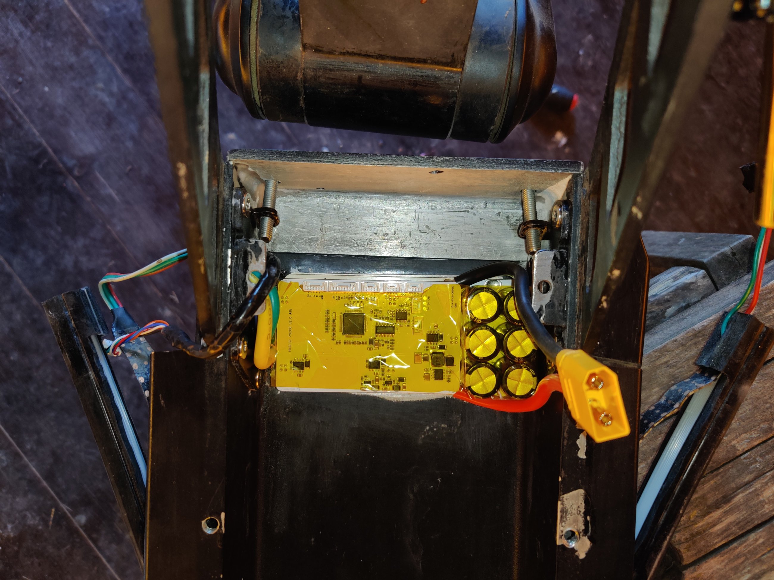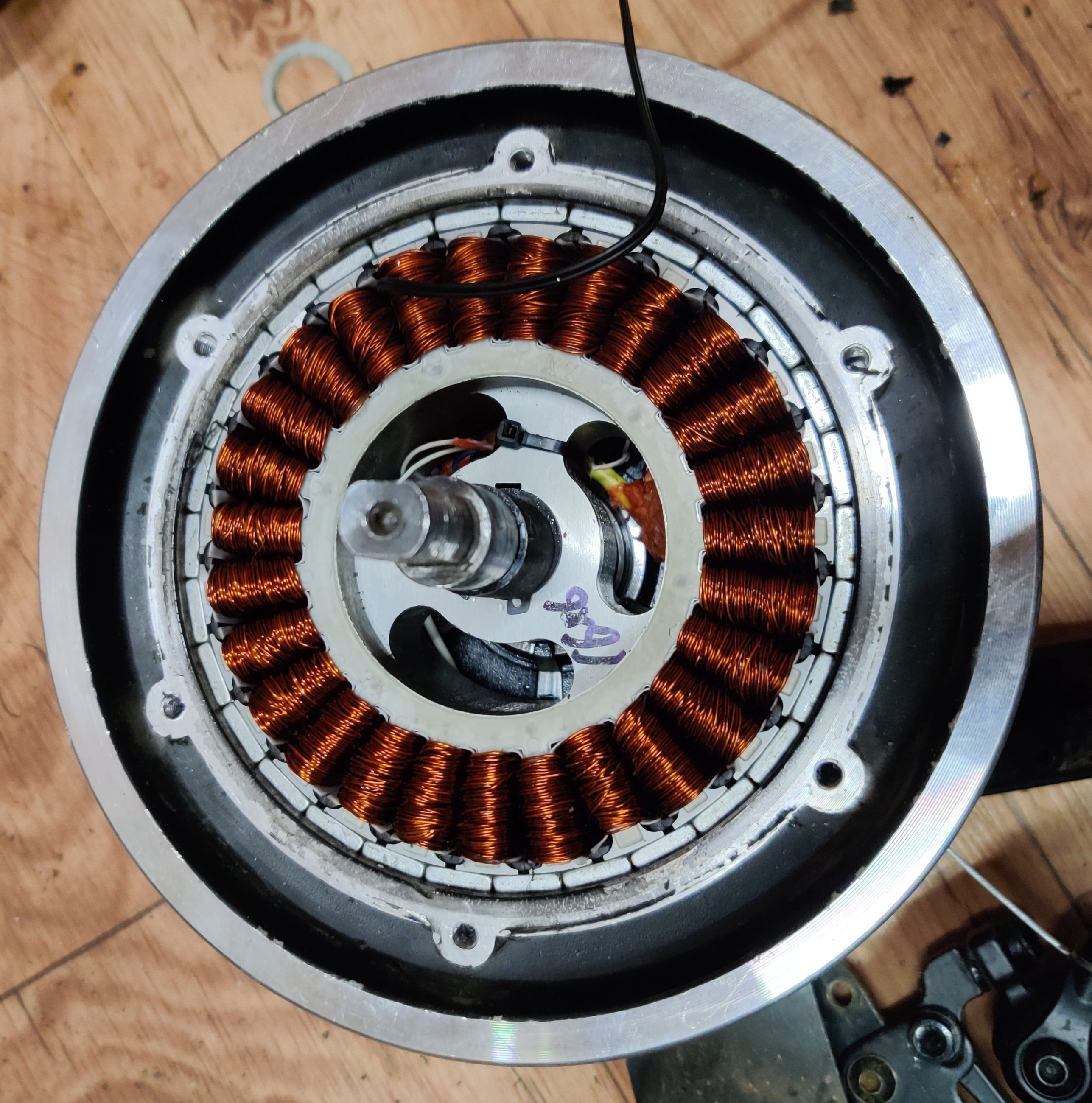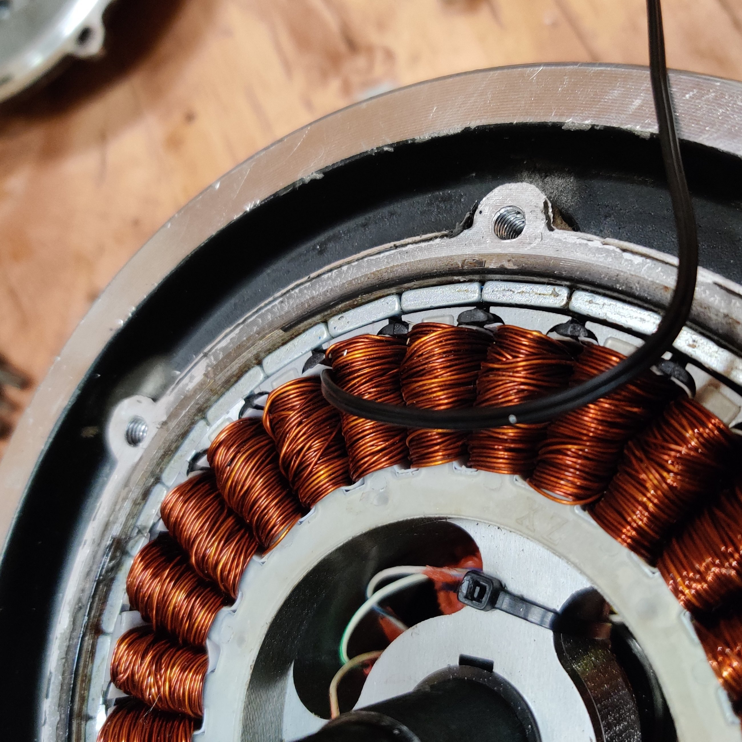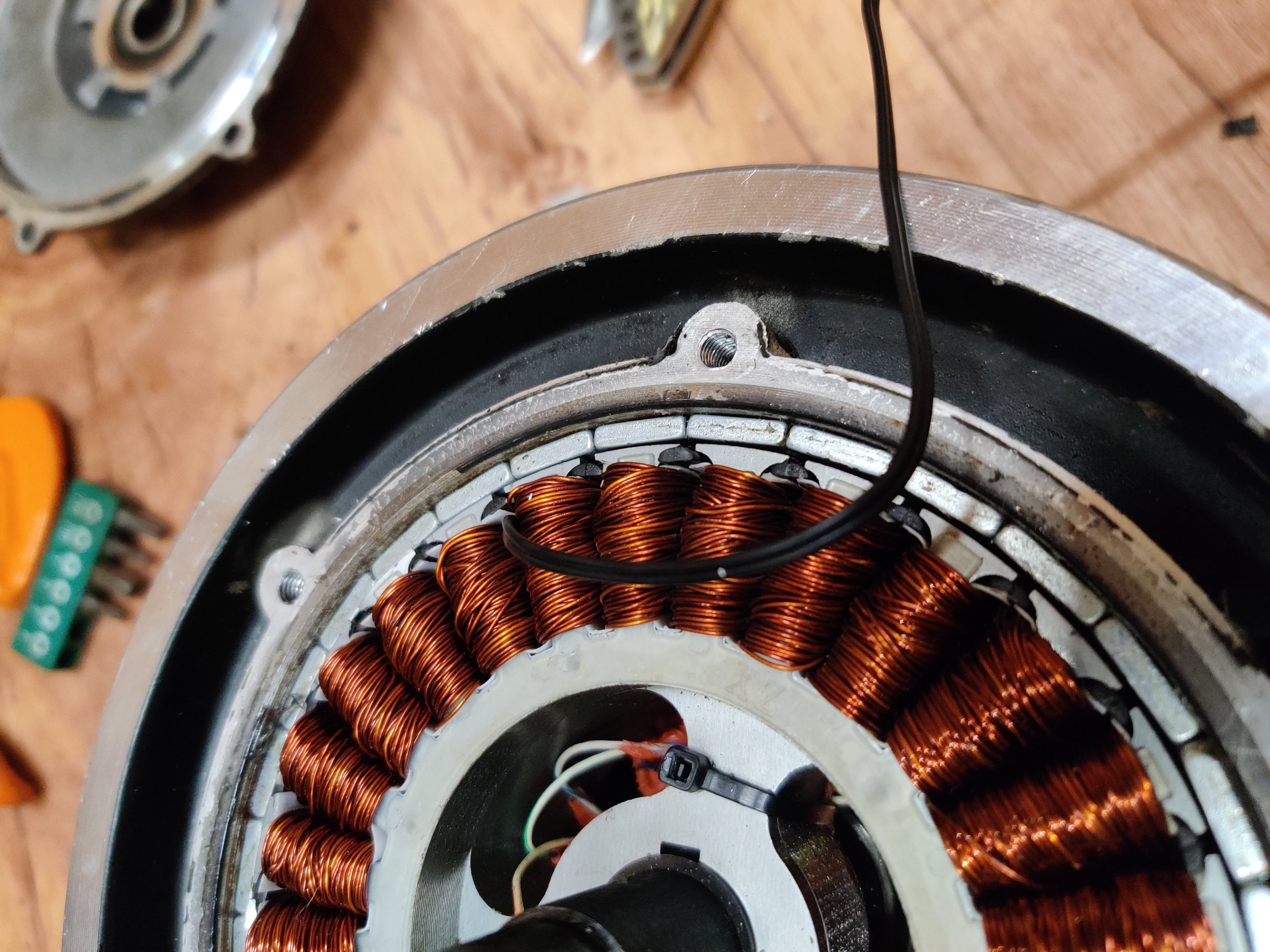 Было интересно узнать, как там поживают обмотки МК, и до скольких градусов они реально греются, особенно после лужения шунта. Поэтому, совместно с заменой фазных проводов, установил термодатчик в колесо...