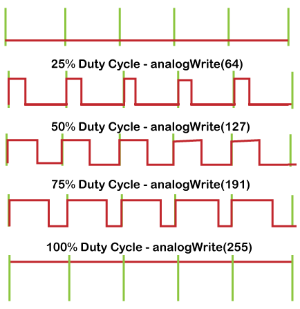 ШИМ (широтно-импульсная модуляция) — это метод управления мощностью, подаваемой на электрическое устройство, путем изменения импульсов напряжения по ширине, т.е. меняются периоды, когда напряжение подается и когда не подается. Это изменение происходит достаточно быстро, чтобы нагрузка (например, мотор или светодиод) воспринимала его как среднее значение напряжения и тока за период времени.